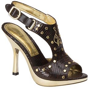 The sexy, cut-out sling-back pump Python-print leather upper Cushioned footbed Slip-resistant sole 3-1/2" gold-colored heel Adjustable buckle closure Gold embroidered kitty logo