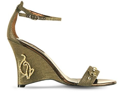 Give a nod to retro glamour with the Baby Phat Linen Cat Wedge. A studded band forms the front, while a slim heel panel and ankle strap hold up the rear. A linen-wrapped wedge supports the look with elegance, and adds a bejeweled kitten logo for extra sparkle. Padded footbed. Linen upper. Leather outsole. 3 1/2" covered wedge heel.