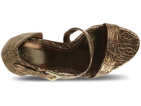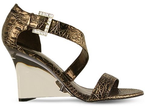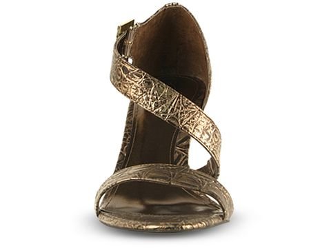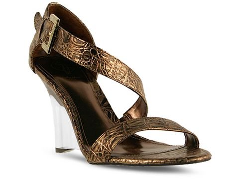 Get ready for your red carpet entrance with the Baby Phat Haley. Its asymmetrical strap hugs your curves just right, and the synthetic croco print spices up the night with its bronzed beauty. Up top, an iced buckle provides a hint of glitter to balance the see-through wedge heel. Padded footbed. Synthetic upper. Nonskid outsole. 3" Lucite wedge heel.