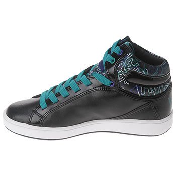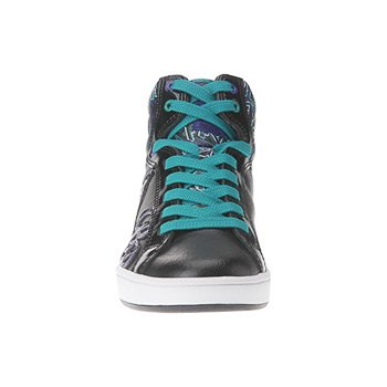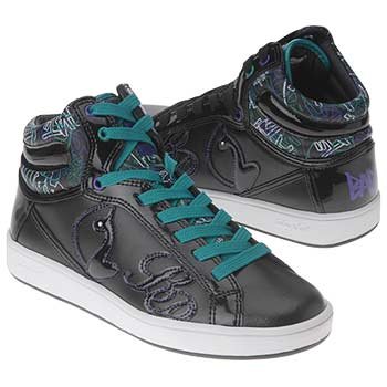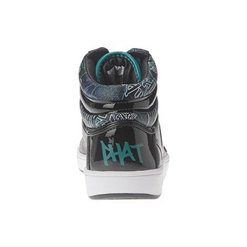 Embrace the 80s fashion resurgence with these basketball inspired Baby Phat Tag Cat Hi top sneakers. Smooth leather upper in a casual athletic high top sneaker style with a round toe. Shiny patent overlays, 80s style graffiti patterns and stitched patent logo accents add smooth detail. A full lace-up front and padded asymmetrical collar and tongue create comfortable fit. Faux leather lining and cushioning insole, flexible midsole. Durable rubber traction outsole.
